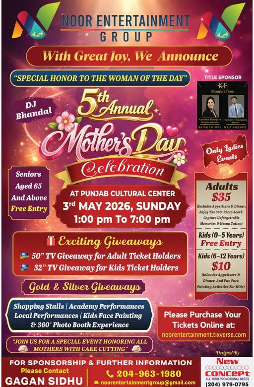Celebrate Mother’s Day at Noor Entertainment Group’s 5th Annual Mother’s Day Celebration on Sunday, May 3, 2026, from 1–7 PM at Punjab Cultural Center.