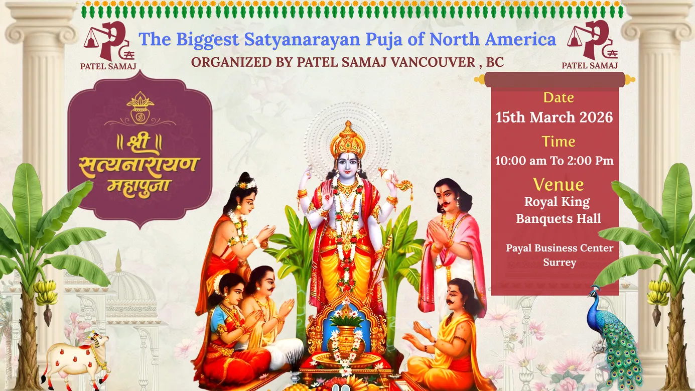 Patel Samaj of B.C. proudly invites you to the Grand Satyanarayan Puja 2026, with a vision to unite the entire Gujarati community under one divine cause.