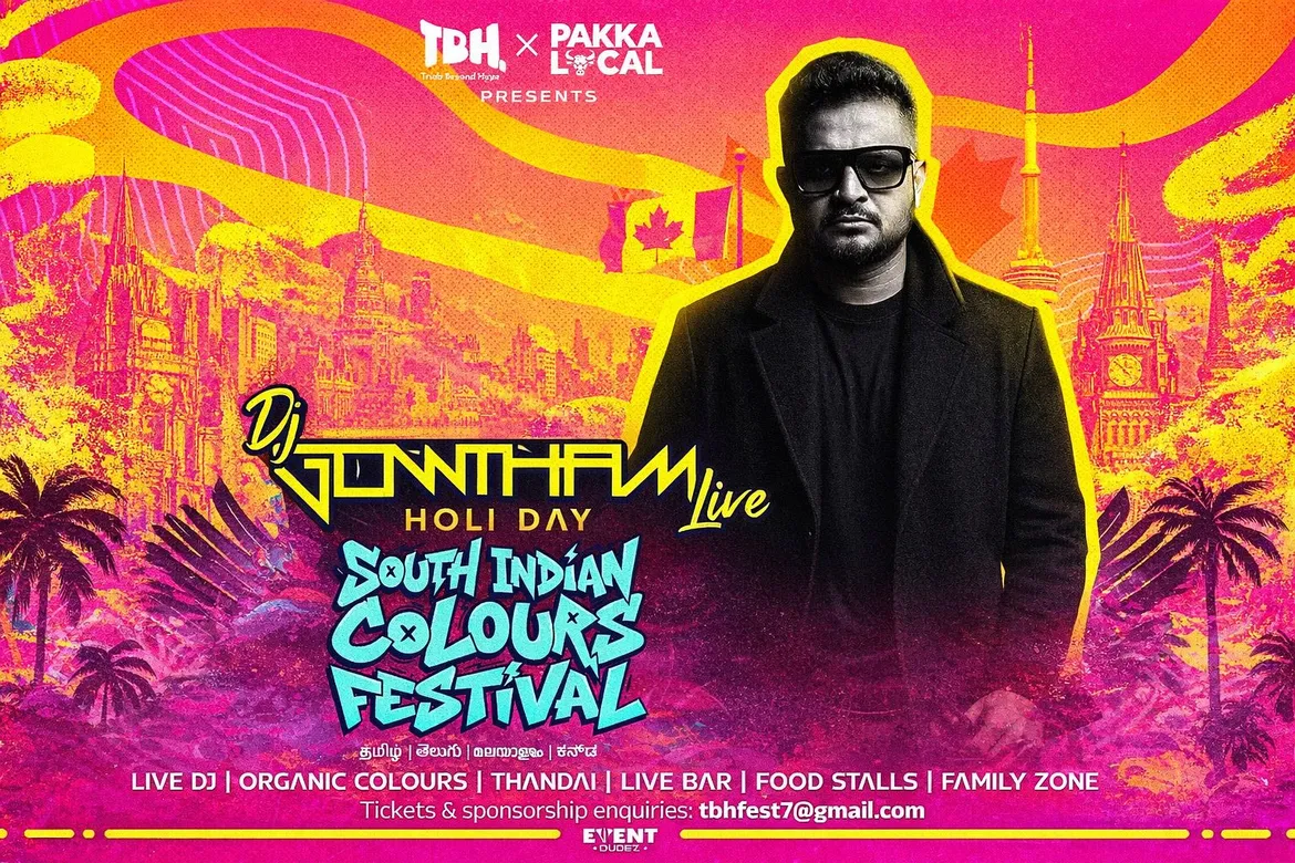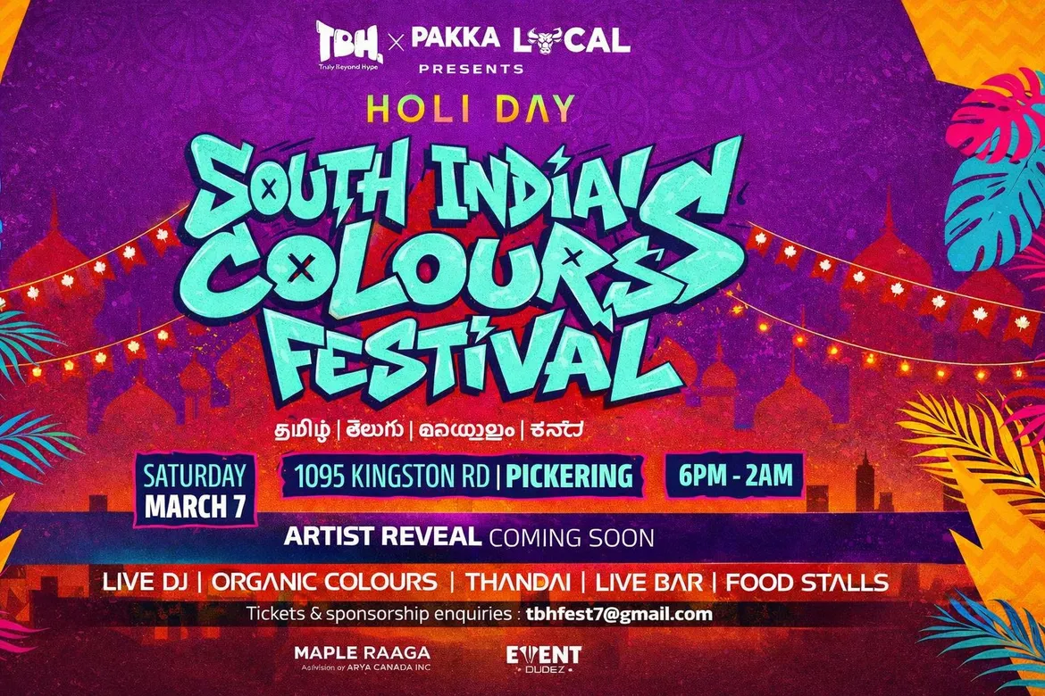 Toronto’s first-ever South Indian exclusive indoor Holi—headlined by DJ Gowtham + 3 DJs. Family zone, organic colours, food stalls, thandai & full bar with 2000+ crowd.
