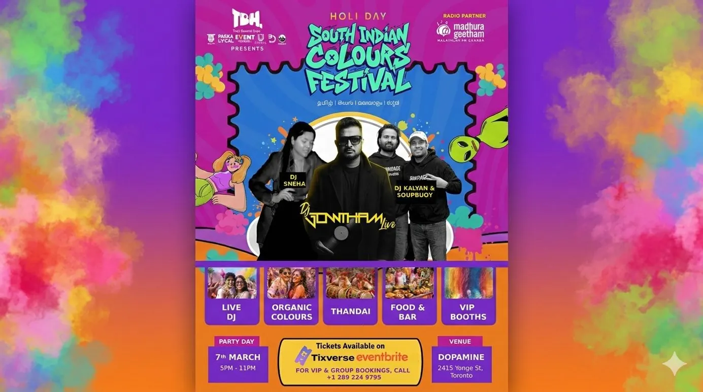 Toronto’s first-ever South Indian exclusive indoor Holi—headlined by DJ Gowtham + 3 DJs. Family zone, organic colours, food stalls, thandai & full bar