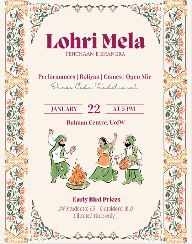 Join us for an evening filled with warmth, culture, and celebration as Pehchaan-e-Bhangra brings the spirit of Lohri to the University of Winnipeg!