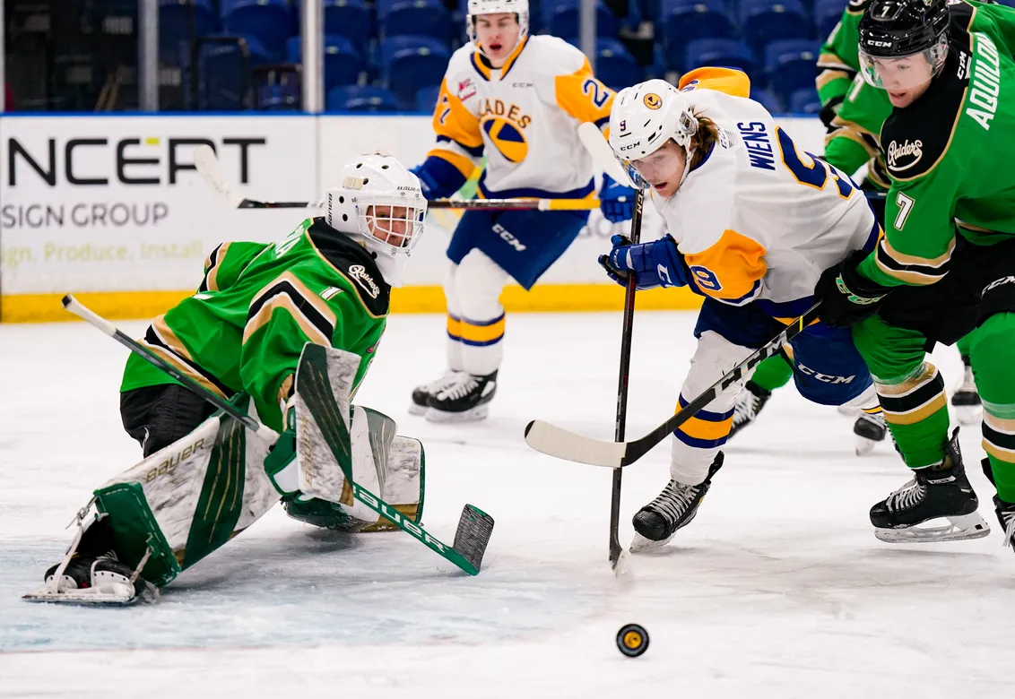 Thrilling WHL showdown: Prince Albert Raiders host Saskatoon Blades in intense junior hockey action at Art Hauser Centre.