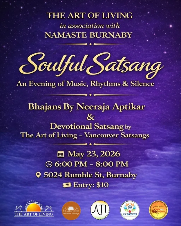 Save the Date – Bhajans, Satsang & Kirtan Night in Burnaby presented by Namaste Burnaby in association with Vancouver Satsangs (The Arts Of Living), and supported by India Cultural Association (ICA) Of Vancouver!